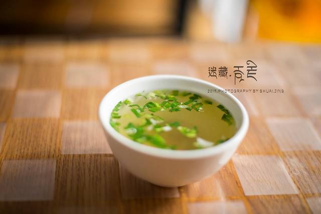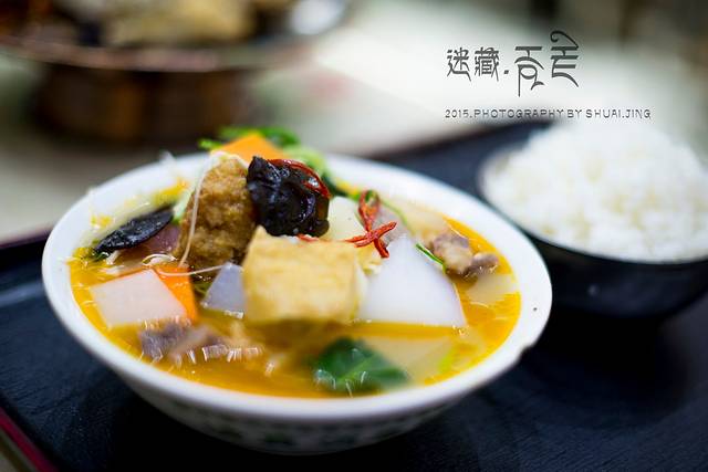 牛肉、羊肉、羊杂碎熬制成汤,汤色清澈见底,汤味极鲜。