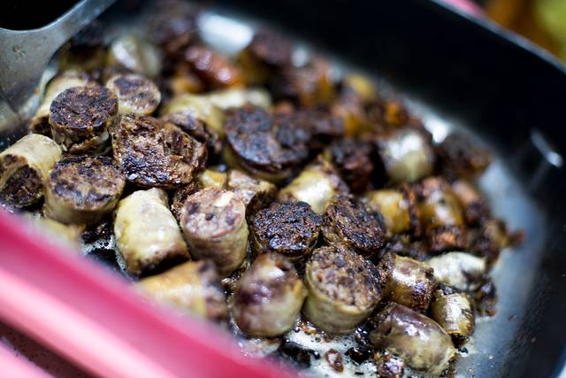 羊肠分为肉肠和面肠,这是肉肠,是羊的内脏等经过调味制作而成的。煎炸成这般糊样看起来好像中医的灸条段。