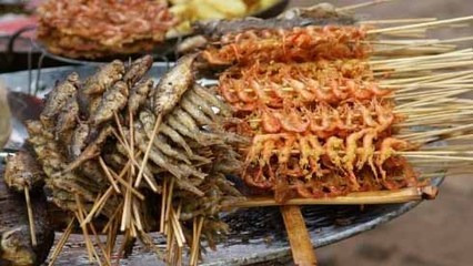 洱海边还有很多小摊,卖的都是海里打捞的新鲜小鱼小虾,串成一串裹上面糊入油锅煎熟,吃辣的就再撒些辣椒粉。