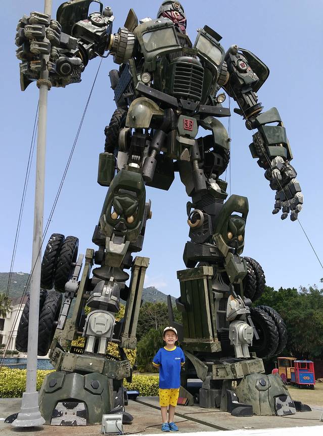 下午闲逛,孩子终于见到了小广场上的关公变形金刚,开心的不得了。