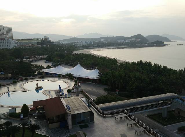 17日下午抵达三亚,第一晚住在珠江花园酒店高级海景房,但安排在最边上的房间,视线不好,联系前台第二天就调到中间的房间。有人说没必要住海景房,因为大部分时间在海边,我喜欢晚上对着大海安静的抽烟、喝点小酒,看个人的喜好了。周围酒吧一条街比较吵,23点以后就安静下来。