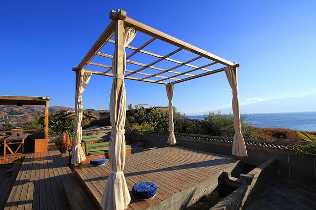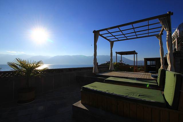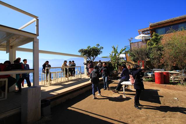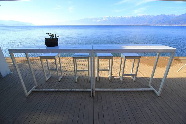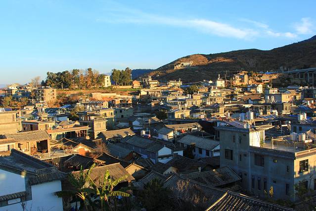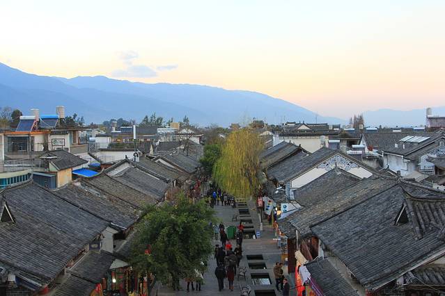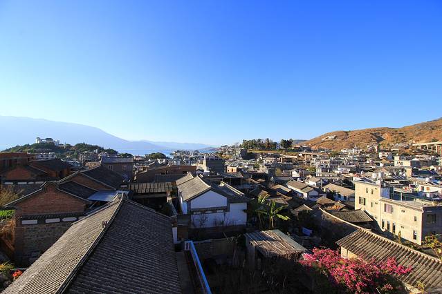 我们的客栈是一览小筑,这个客栈地势很高,在四楼楼顶有一个大平台,可以看到双廊镇全景,在这里看日出日落都行,往西边望去能看到苍山,就是离海比较远。
