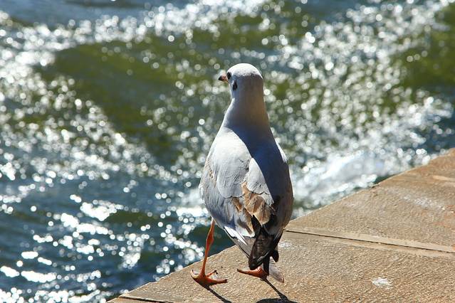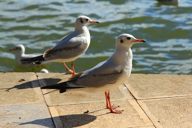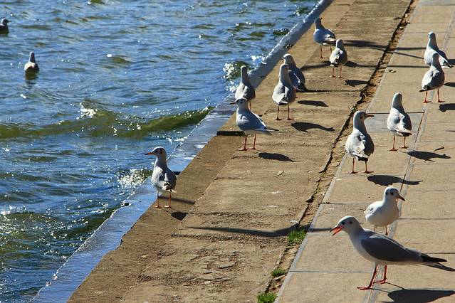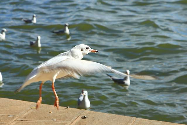 在湖中间不时会有公园内部的快艇经过,他们会向湖中间投放吃的,这是所有岸边的红嘴鸥都会想湖中间飞去,一下就安静了。。。