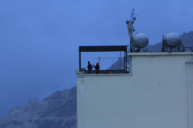 之前听人说,雪山山顶云彩一多,第二天就会下雪。的确,真的下雪了。知道日照金山看不到了,我们也没有在德钦停留太长时间,因为一早就开始飘雪花,爬一会雪下大了山路不好走,于是很快就往香格里拉赶了。