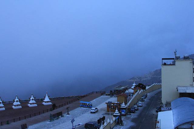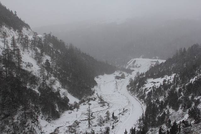 第二天起床一看,雪山呢???雾太大,雪山完全看不见了。天上还飘着雪花。