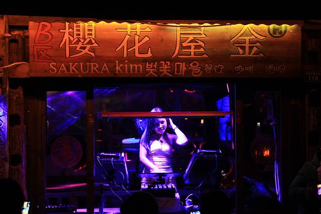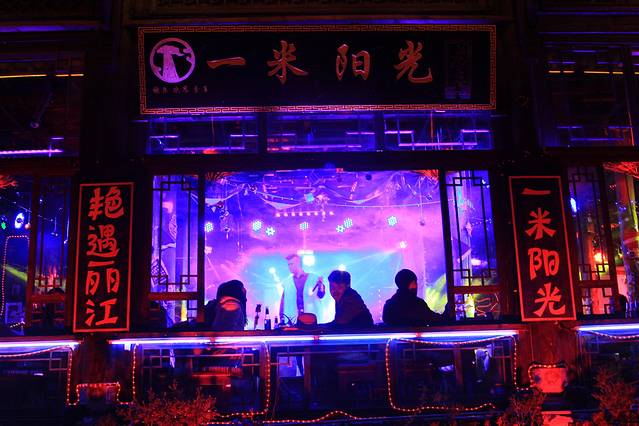 最热闹的地方,也是人最多的地方,就是四方街到大水车之间的区域了。好多酒吧,白天冷清不起眼,晚上就嗨了,感觉能把石板路上的石头震出来。。。