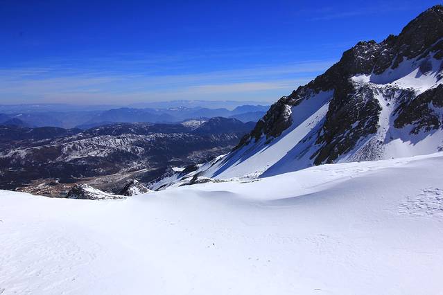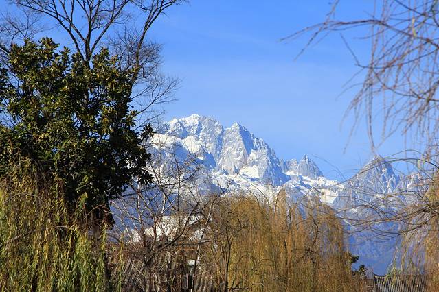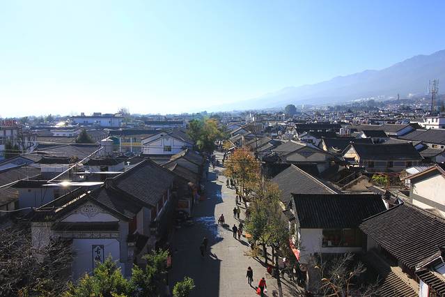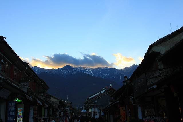 在古城里可以看到玉龙雪山,只不过有点远。如果只是想看雪山的话,到达古城最东边,在狮子山一直往东爬到一个平台,可以清楚地看到整个雪山,也可以看到整个丽江城区的全景。