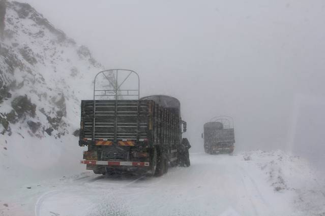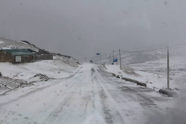 车子必须要装上防滑链,要不然根本开不动,还好我们这个车设施齐全。。。中途很多车都停下来装防滑链,也有不少车掉头返回。。。
