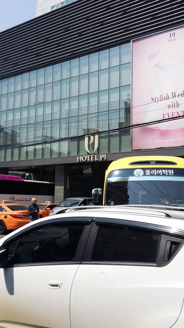 我们住的PJ酒店,离地铁2号线乙支路4街(Euljiro4(sa)-ga)站10号出口,步行约5分钟;或者地铁4号线忠武路(Chungmuro)站8号出口,步行约5分钟。从飞机落地到进酒店约1小时50分钟。酒店有免费的巴士到明洞,路程开车15分钟左右。