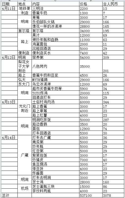 我们是一行四人,都是女生,主要目的是购物和吃,所以没有逛特别多的景点。上面的数字除了地铁便利店和机场外,都是四人一起吃的。