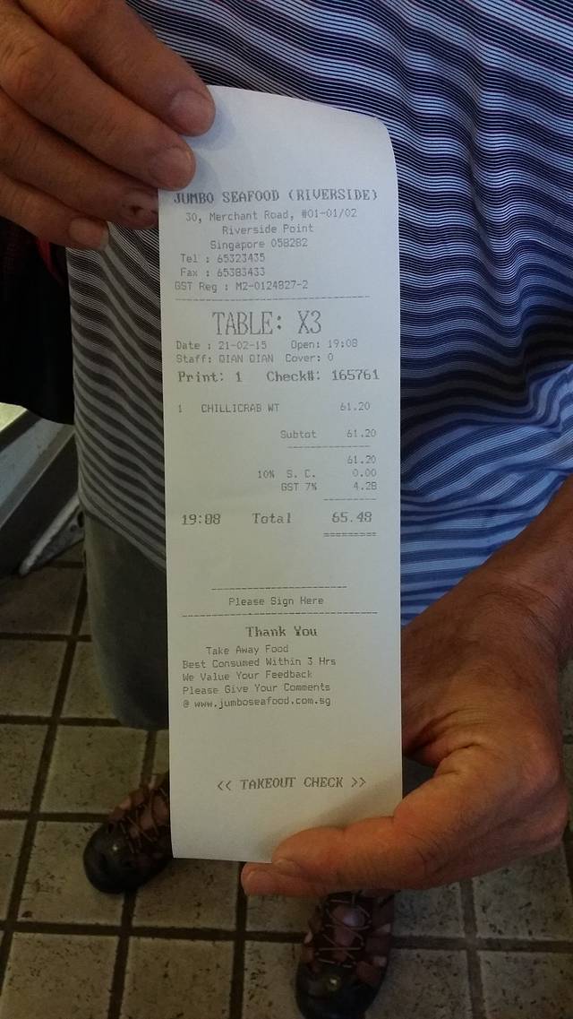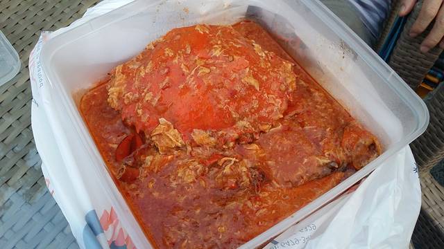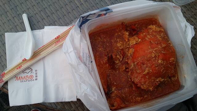珍宝海鲜,据说要预约,可之前行程没定,就没约,正巧走到门口看到等位的人啊那叫一个多,问还有位子么,说连等位都没有位子了,我灵机一动,问,外卖么,对方说外卖啊,我说要等多久,对方说,五分钟~~~然后我就打包了一只每桌必点的辣椒蟹回酒店吃了,回到酒店大概花了半个小时,螃蟹还是热的,真的非常的好吃,而且算算也不算太贵,一只65.48新币,合人民币305块~