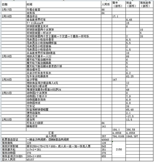 2015年2月春节去的,当时汇率是1新币=4.65人民币,换了2000的新币,记得好像新加坡不太愿意收1000元面额的纸币,好像假的多,所以就换了全是100一张的。一共20张,其中就有两张尾号一个是我的生日,一个是我爸生日,觉得好巧