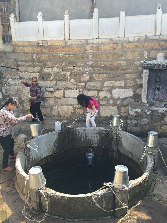 沿着文庙的路一直往上走,出了一个拱门,再沿着小路走上一段,会有标示,左转,就到了古井,会有人在那里打水。古井井口大,水很清澈,井旁边有干净的桶。