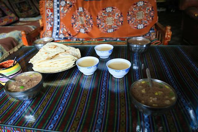 8点左右准备吃早饭~司机师傅索朗大哥找的一家牛肉丁~香喷喷的真好吃热乎乎的,整个人舒服多了。雨中的西藏还是很冷的。因为早上起得很早一路上的颠簸让我们这顿饭吃的非常香。4碗肉汤(里面有牛肉丁)N张饼。还有3磅的甜茶。总共消费90~还算可以~但是吃的时候那种满足感。有种当上CEO迎娶白富美的人生巅峰之感。