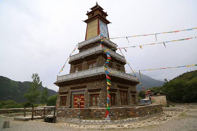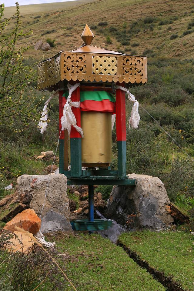 山上的流水会不停的转动转经筒。还伴有铃铛的声音。