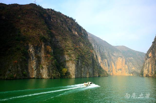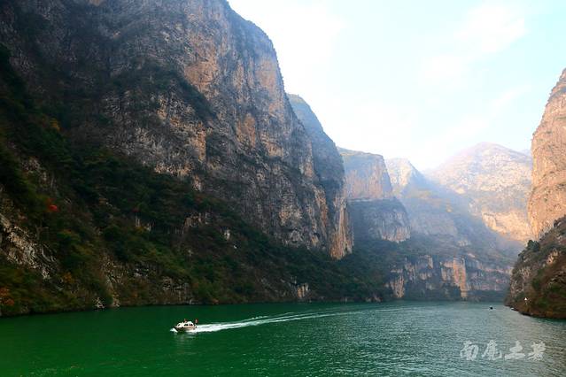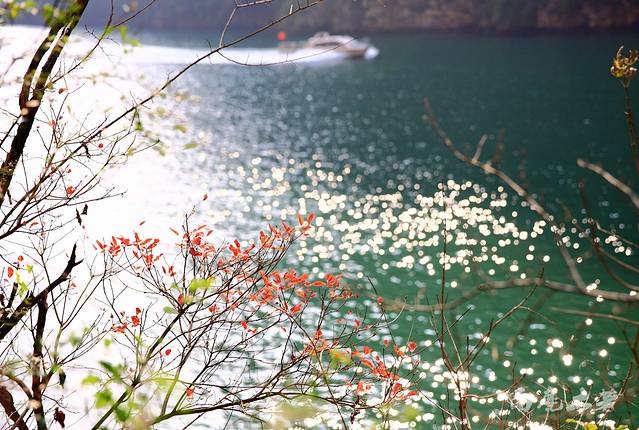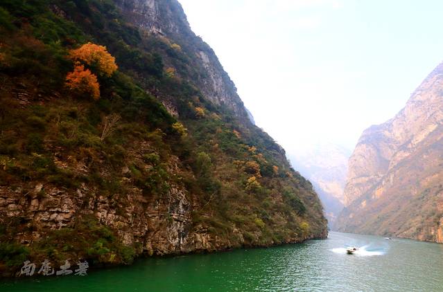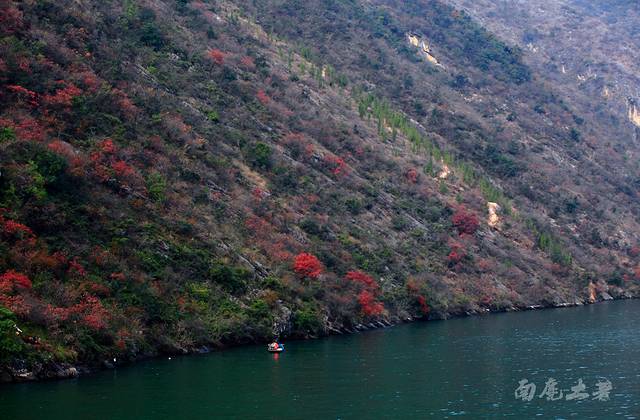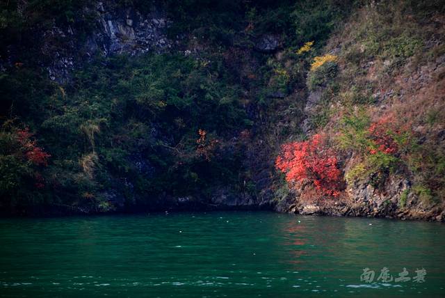 两岸峭壁红叶点点,参差在翠绿的草木和灰褐色山坡,大坝蓄水后冬季已无枯水期,盈盈的江水从脚下穿过,山野的奔放与缠绵的流水各抒风骚,彰显小三峡独有的气质。
