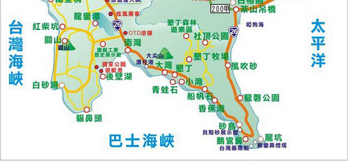 放一张垦丁的地图。垦丁不大,租一辆电动车很方便。