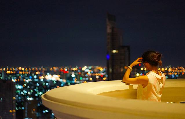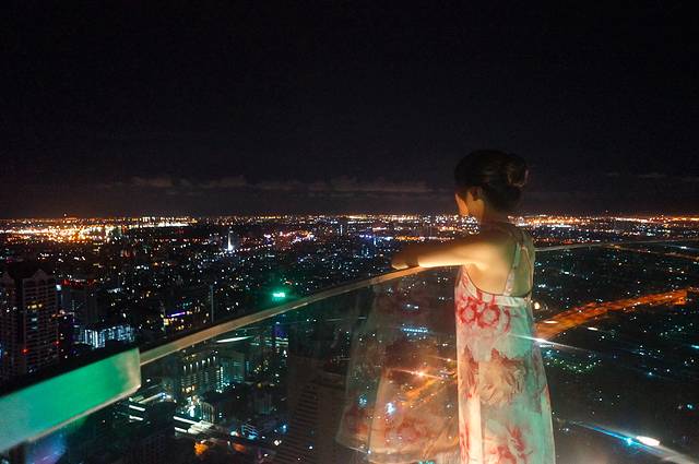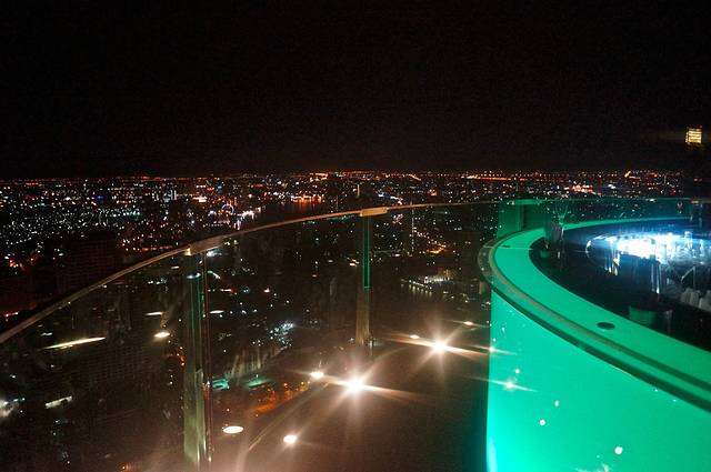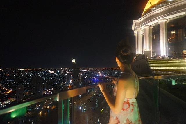 莲花酒店的sirocco餐厅和sky bar在63层200多米的高空,我站的这个位置是不能拍照的。偷偷拍了一张。那个绿色圆环就是sky bar,全部是站着的。餐厅就是摆桌子那个地方,餐厅据说人均7.800才能吃饱。sky bar一杯鸡尾酒150左右,还是这个容易接受。我第一次来就发现在这里就餐其实不太好,去酒吧的人络绎不绝的从你身边穿过,很影响气氛哦