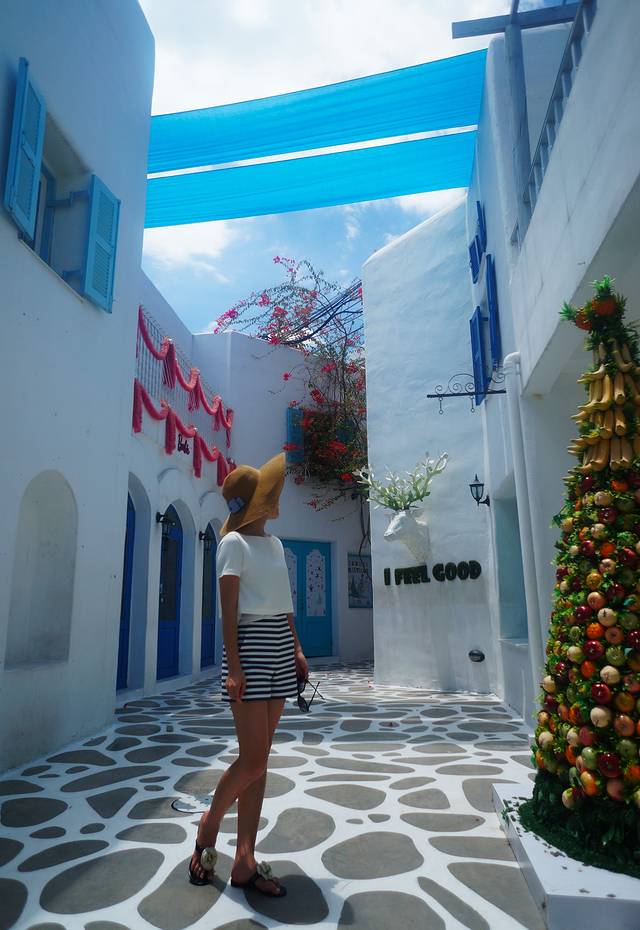 第二站,圣托里尼公园。在从曼谷到华欣的路上就能看到这个公园.门票是50b一个人,旁边还有个水上世界,不过38度的高温,暴晒之下一定会中暑吧。圣托里尼公园没什么娱乐项目,就是拍照,各种摆