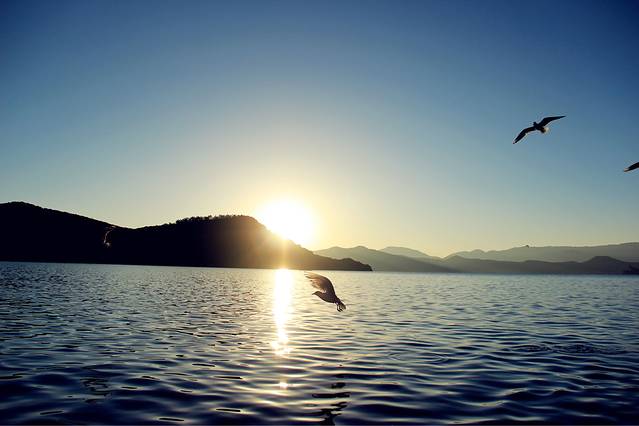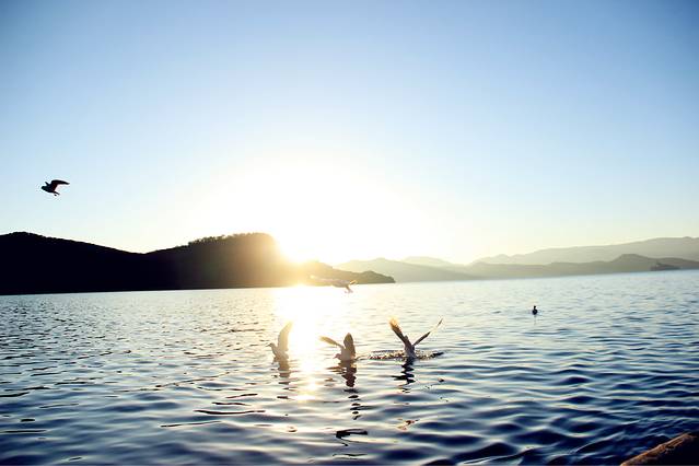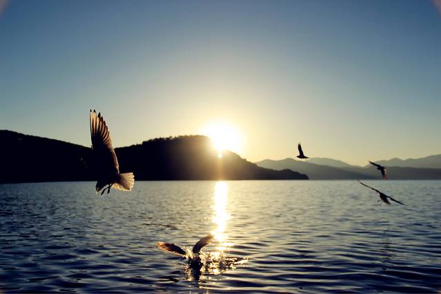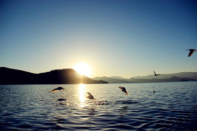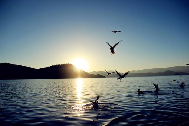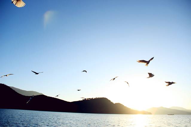 清晨的泸沽湖,静谧、优雅,当太阳升起的那一刻,阳光洒满整个湖面波光粼粼,海鸥兴奋群起…预示着美好的一天。