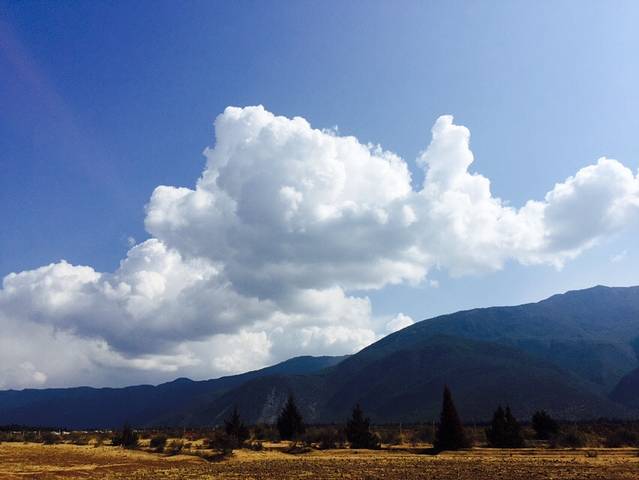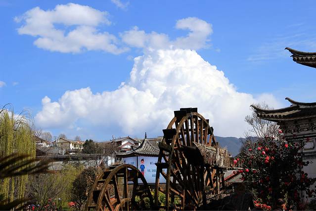 丽江古城标志性建筑—大水车,很多人来到这都要在这里照张照片,我却被水车后面的大朵云彩深深吸引…