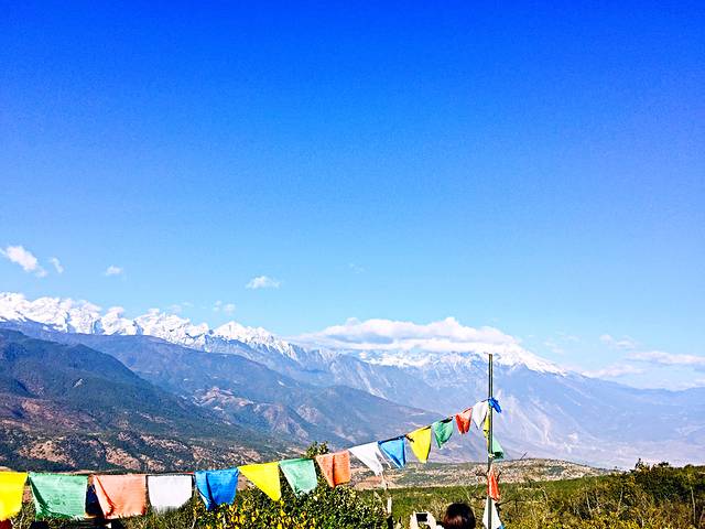 蓝蓝的天空飘着大块的云朵,院子的二楼还可以看到美丽的玉龙雪山。