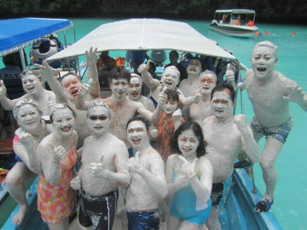 整条船的人都抹成这个样子,装成僵尸,你吓唬吓唬我,我吓唬一下你,大家别提玩的有多尽兴了,可惜我们只是顾着玩乐,没有拍下一张集体大合照,这个照片是从网上扒来的,虽然不是我们船上的人,但是大家看一下就知道牛奶湖有多特别了,可以让整条船不分年龄却玩得如此的欢乐融洽。