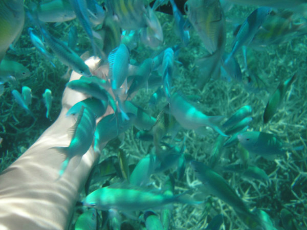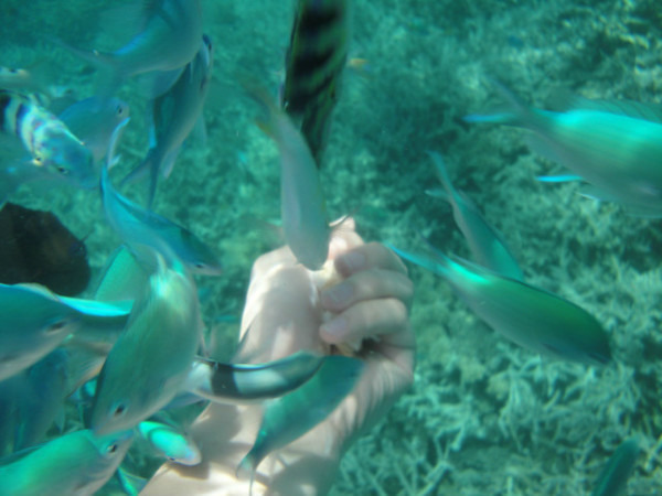 还没松手果然会引来很多鱼儿,哈哈哈!!真是有意思。