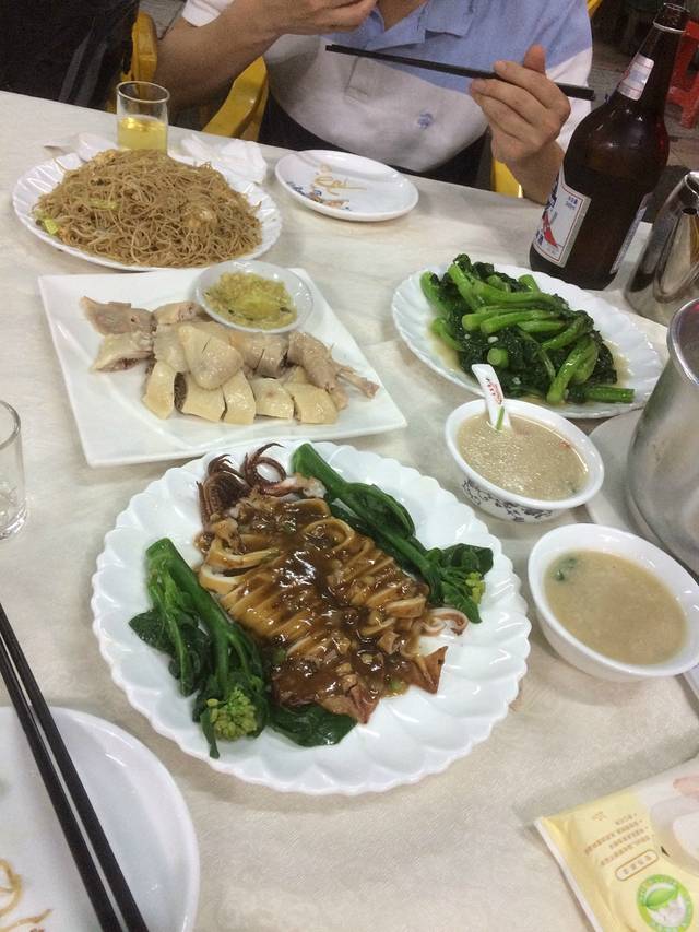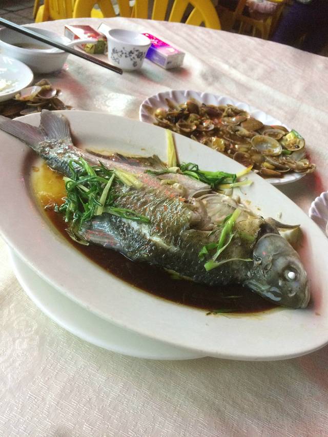 植村大排档,这就是我连喝了三个晚上的粥的地方,最后一晚吃的火锅鱼,不过瘾,还是让老贾去给我买了一份外卖的咸骨粥。附近大排档很多,基本大同小异,但是唯独这家大排档翻桌不断,别家只有零散的几桌客人,他家却坐满了,营业时间从下午5点到夜里3点,有宵夜,所以再晚一点,也有好吃的。推荐菜,咸骨粥、鸡粥、皮蛋粥、清蒸各种鱼、鱿鱼筒、炒花甲、白切鸡、哎呀好多好多了,人多可以多点些,总之很好吃。粥里面的鸡肉或者排骨,都很多块,但是我更爱粥,那个味道一辈子也忘不了。清蒸的鱼很便宜,18、28一斤,而且鱼不大,2个人吃1条基本不会浪费什么。而且价格也不高,2个人120左右就可以吃的非常happy,重点是有鱼有肉,味道不错。
