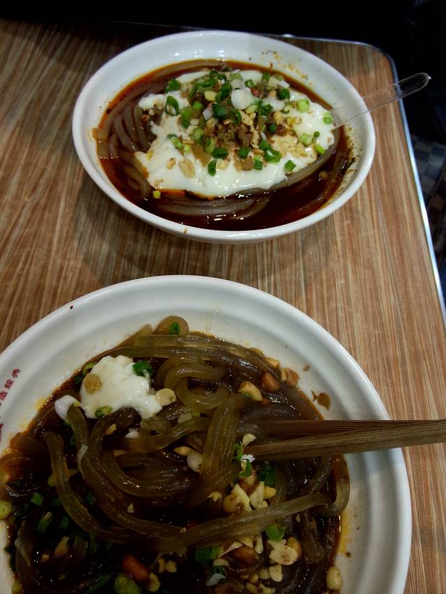 第一天养精蓄锐,第二天就开始以步行为主了,我们从两路口坐公交车到解放碑,那里有个大型的购物商圈,在商圈里头有很多小吃街,但是如果你是广东人估计受不了这种辣,但是这种辣就是一种你吃完了会拉肚子,拉完肚子还想继续吃的感觉,重庆的豆腐脑一定要尝尝,还有重庆的酸辣粉,粉特别爽口,价格都比较平民,一般都在10元之内,哦,对了,记得要吃重庆的小汤圆哦。