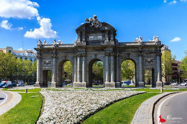 丽池公园旁边就是阿尔卡拉门,建于1788年,是马德里仅存的几个古老城门之一。大门为新古典主义风格,采用大型罗马凯旋门的形式,有5个门洞,其中3个是半圆拱门,另2个为平拱门。