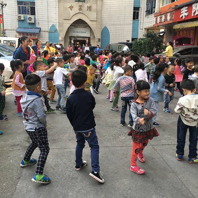 住的青旅楼下有家幼儿园,早上孩子们在做早操。
