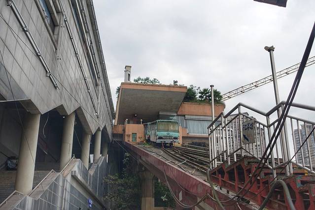 这次的意外收获就是这里。有段铁轨直直深入嘉陵江里,上面还有一个小火车。这个好像千寻里深入海中的海上列车。不过这个看来是废弃多年不用的了。据那里的职员说以前是在上面拉着客人进入江里上船的,想想也是蛮神奇的。