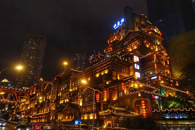 从南山下来可以去泉水鸡一条街吃鸡,但是我们没有去。因为我们心心念念着洪崖洞。从山上下来倒是蛮好打车的。碰见了一个油嘴滑舌的成都司机,一路从山顶飙车下来,各种急拐弯,比过山车还要猛嘞。