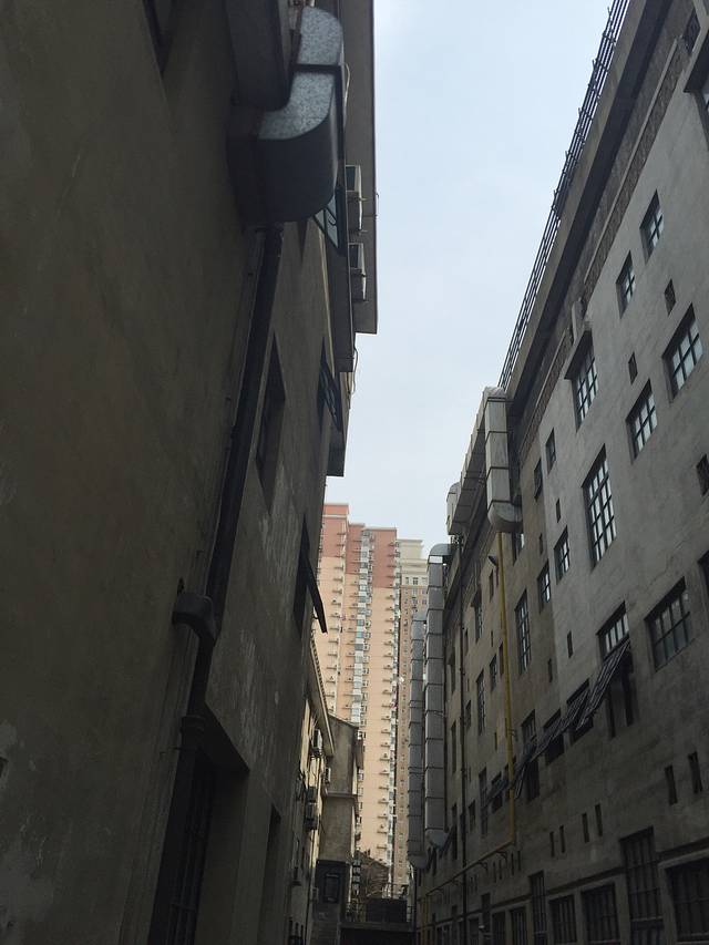 1933老场坊的北侧,狭窄的巷子,远处已经高楼林立。