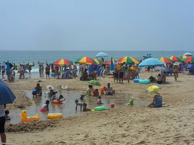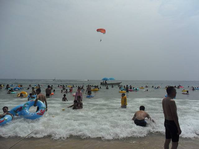 大角湾游乐场入口,前面就是大家游玩的地方。这里可以租橡皮床、游泳圈、沙滩椅、遮阳伞等等,冲浪后可以到岸上的洗澡间冲凉,收费较为便宜,换衣+冲凉,两次不到十元钱每人,去换泳衣时,他们会发给你一个标牌,回来冲凉时交回