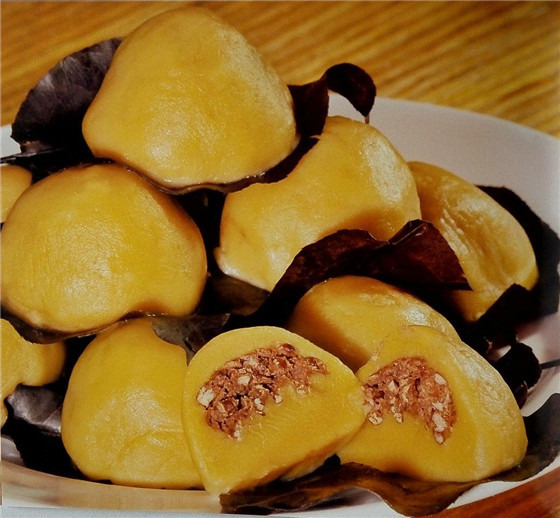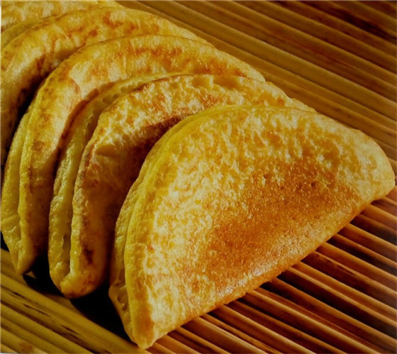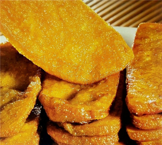 油糕又叫年糕,在黄陵有着悠久的历史。它的制作方法其实是软膜的升级:将软糜子面揉和,在35度左右的温度下发酵五六个小。待有浓烈酵香气味,味道微甜,然后将其捏成窝头状,放入锅中蒸熟。趁热将这些“窝头”放在案板上揉制成宽约20厘米、高约5厘米、边缘圆滑的长条形状,俗称油膏条。等其自然冷却,挥发水汽变硬方可切片,最后放入烧开的菜油锅炸熟即可食用。此时的油膏,颜色金黄发亮,口感外酥里嫩,香滑软甜。据说,在清乾隆年间曾作为贡品敬献朝廷,后被列为宫廷御膳。