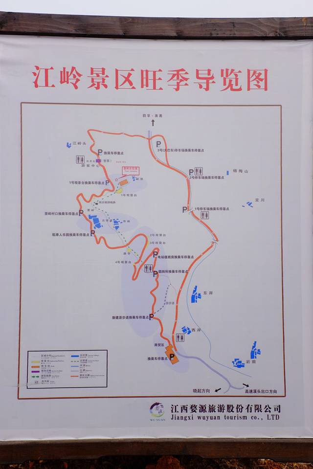 江岭景区导游图,景区内有盘山道可以到达最顶端,然而旺季基本上只有景区通勤车和当地村民的“黑车”能在上面开。
