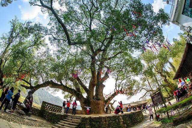 严田古樟从名字可知晓这里因一棵1600多年的古樟树而得名。有天下第一樟之称。作为此次婺源之行的第一个景点,如果把看油菜花必做吃大餐的话,严田古樟算是一道开胃菜。景区半个小时到一个小时就能转完,值得看的点详见下面的景区导游图以及下面的配图。别看园子不咋大,有山有水有树林,邻里乡亲挺和睦,老少爷们更合群(……好像整跑偏了)。临行前听说有这么棵大树,特意把三阳12mm/2.8全幅鱼眼镜头带来了,鱼眼包容一切的视角将整个古樟树尽收眼底。