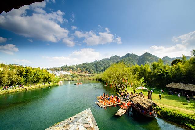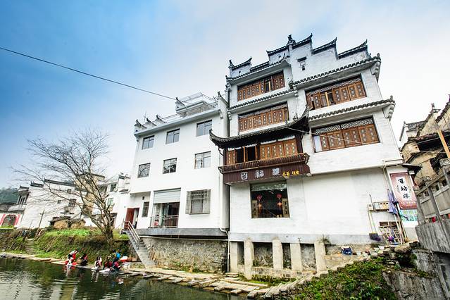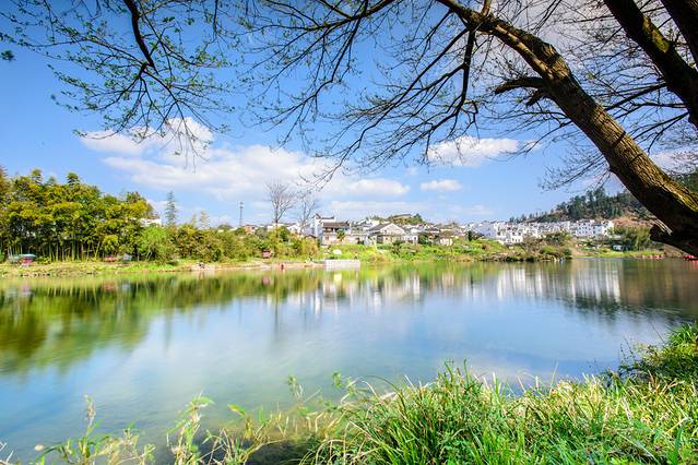 从对岸看怡情泛舟区远处的风景。徽派建筑的小房子在水中倒映。