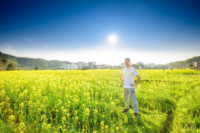 来一趟婺源,总要在油菜花里照张相吧。下午三四点的时间,太阳正足的时候。对于一般人而言,逆着光拍摄,基本上都是废片。然而老范有看家法宝——滤镜,让你的天空不再一片死白,让你的地面不再一片暗淡无光。