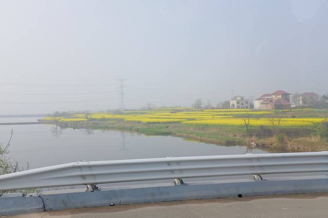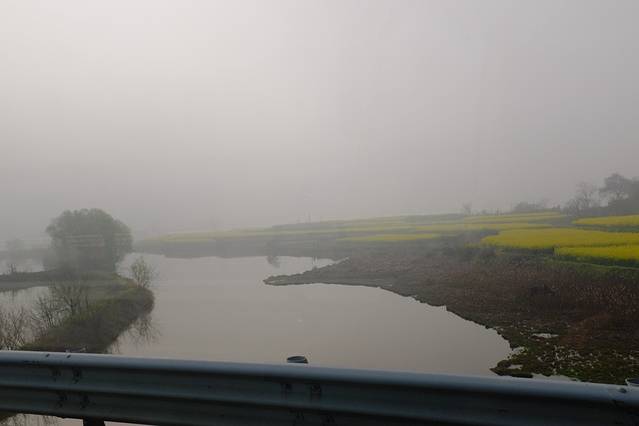 高速的途中,快到九江长江大桥时开始起雾了,雾气中的油菜花田。