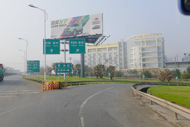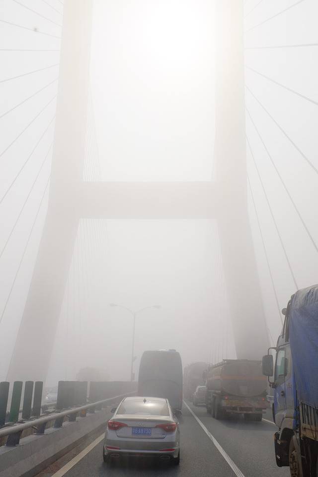 九江长江大桥,雾大的能见度不到十米的赶脚,桥上的字都看不清。车也因为大雾而缓行。