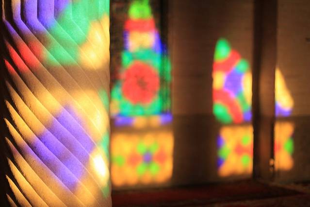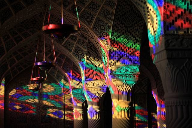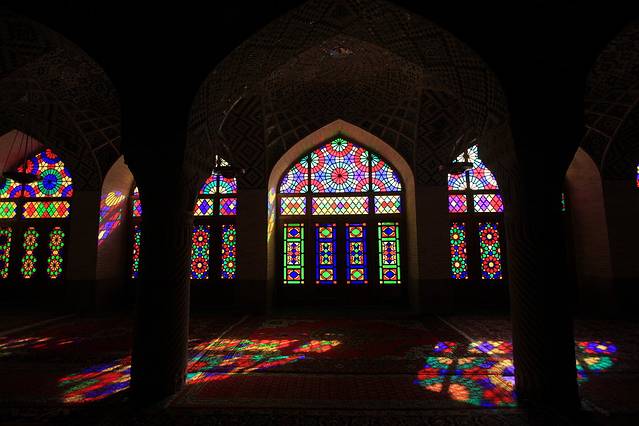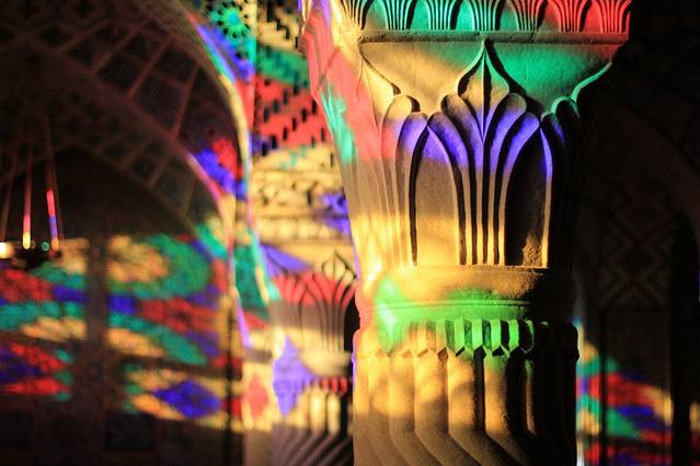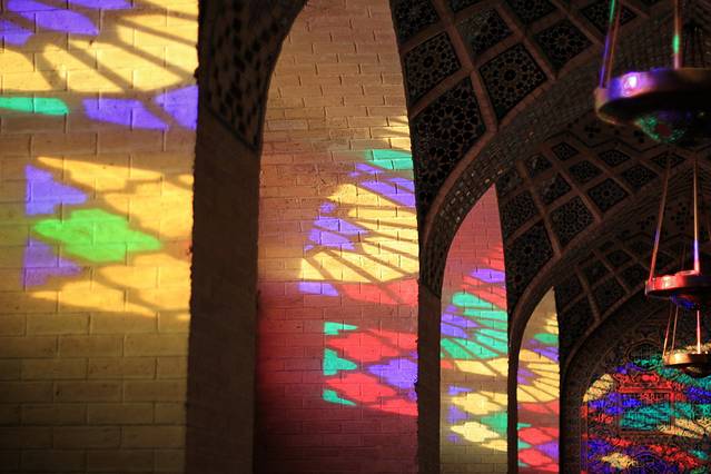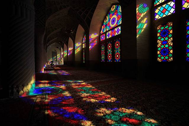 其实知道设拉子这个城市,就是因为那座粉红清真寺。这座清真寺规模不大,没有悠久的历史,这里也没有发生过什么著名的事件,但却被称为世界上最美的清真寺。这座清真寺修建于卡扎儿王朝,以当时的国王命名,国王当然不会叫“粉红”,原名莫克清真寺,卡扎尔是伊朗历史上倒数第二个王朝,为自己好记,我总是把波斯的王朝换算成中国的王朝,这卡扎尔就相当于中国的明朝吧。
