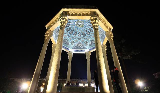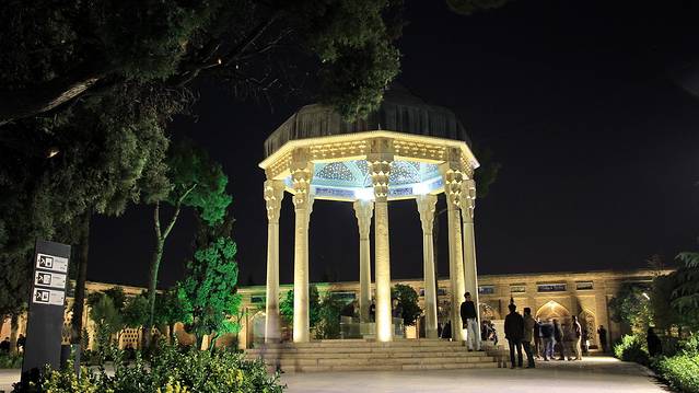 哈菲兹于伊朗,就如同李白之与中国,被称为“设拉子的夜莺”,据说每个伊朗家庭都会有一本哈菲兹诗集,除了了诗歌本身,据说每家每户还用他的诗集占卜吉凶,可见也是被神化了的人物。他生于乱世,目睹伊尔汗国和帖木儿先后统治波斯,抑郁而亡,这一点来看更像是中国的杜甫,死后人们为他在设拉子修建了陵墓。而现在看到的是1930年代重新设计和修建的,算不上真正的古迹,却是伊朗文青聚集的地方。