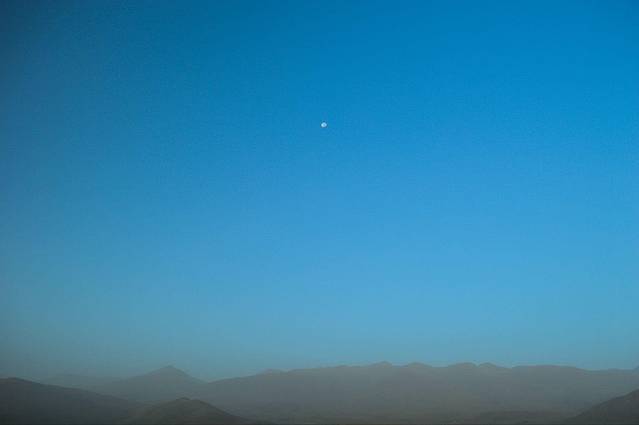 早晨一层朦胧的雾气在山间围绕 那时的月亮也高高挂着