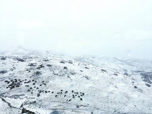 黑色的牦牛,配上白色的雪。