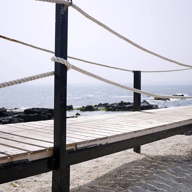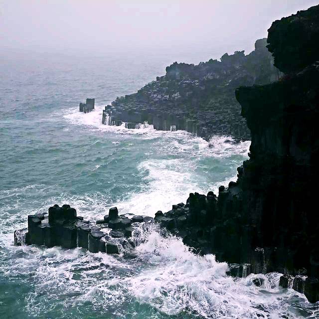 眼看到了中午,我们还没有吃饭,周围也没有店铺,索性不吃了,继续我们的行程。顺着山路我们走到了柱状节理带,期初我并不知道这是什么,通过基友解释,当我站在观光台向下望去的时候,大自然的鬼斧神工又一次的震撼了我,我对基友讲,这不就是英国的巨人之路吗!轻抚着身旁的火山岩,你会情不自禁的去回想济州的诞生,火山的喷发、凝固、堆积。