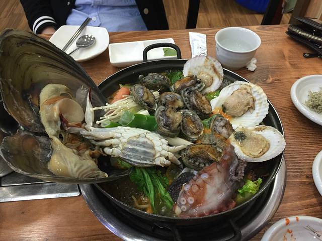 基友是出了名的能吃能睡,饭后就一定要去睡一觉,我们回到宾馆午休后决定晚上去找寻学姐说的海鲜汤,一路上我们凭借感觉,此时BGM应该响起来,跟着感觉走~让他带着我~虽然走错了路但是最后还是找到了特别出名的三姓穴海鲜汤。在海鲜汤端上来的那一刻,锅内的鲍鱼还在不停地扭动着,伴随着汤的沸腾,从海洋带来的新鲜的气味向你不停地袭来。老板看我们是外国人还非常热情的帮我们熬汤,老板用手势告诉我们,要将碗端起来直接喝掉,都说艺术是无国界的,此时我只觉得手势才是无国界的。