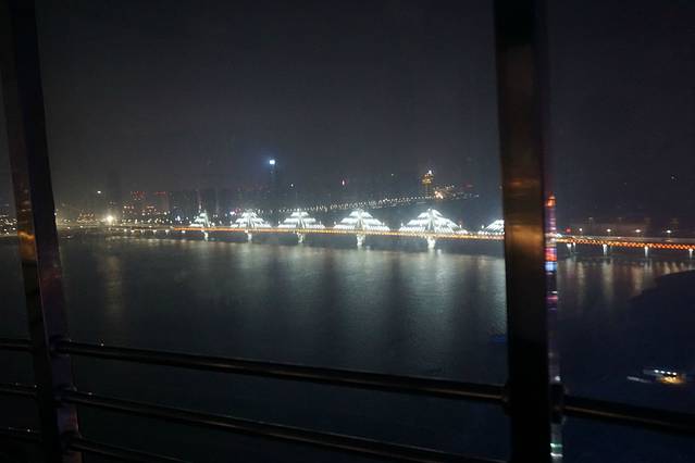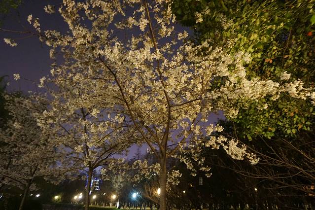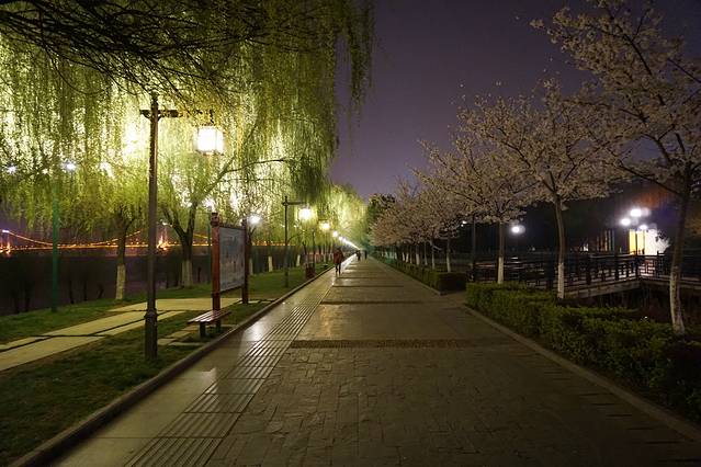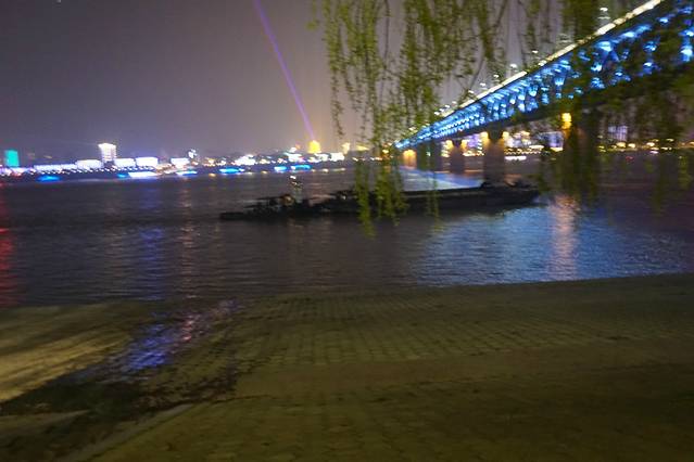回青旅短暂休息后,八点半左右我和云子打车到了晴川阁,10块。 想要在晴川阁上看看武汉长江大桥的夜景,但是晴川阁晚上5点就停止进入了,我俩便沿着路向前走没几步就看见了长江大桥和一个大广场。广场就在江边,视线很好,能看见江对岸的夜景。右手边就是长江大桥,灯光一直变换着颜色,还能听见火车穿过的轰隆声。 顺着江往前走一路美景,柳树樱花对立,再加上路灯的照应,很有意境。